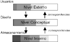 - Nivel interno o físico. Se refiere al almacenamiento físico en el se describe cómo se almacenan realmente los datos en memorias secundarias, en qué archivos, su nombre y dirección. También estarán los registros, longitud, campos, índices y las rutas de acceso a esos archivos.